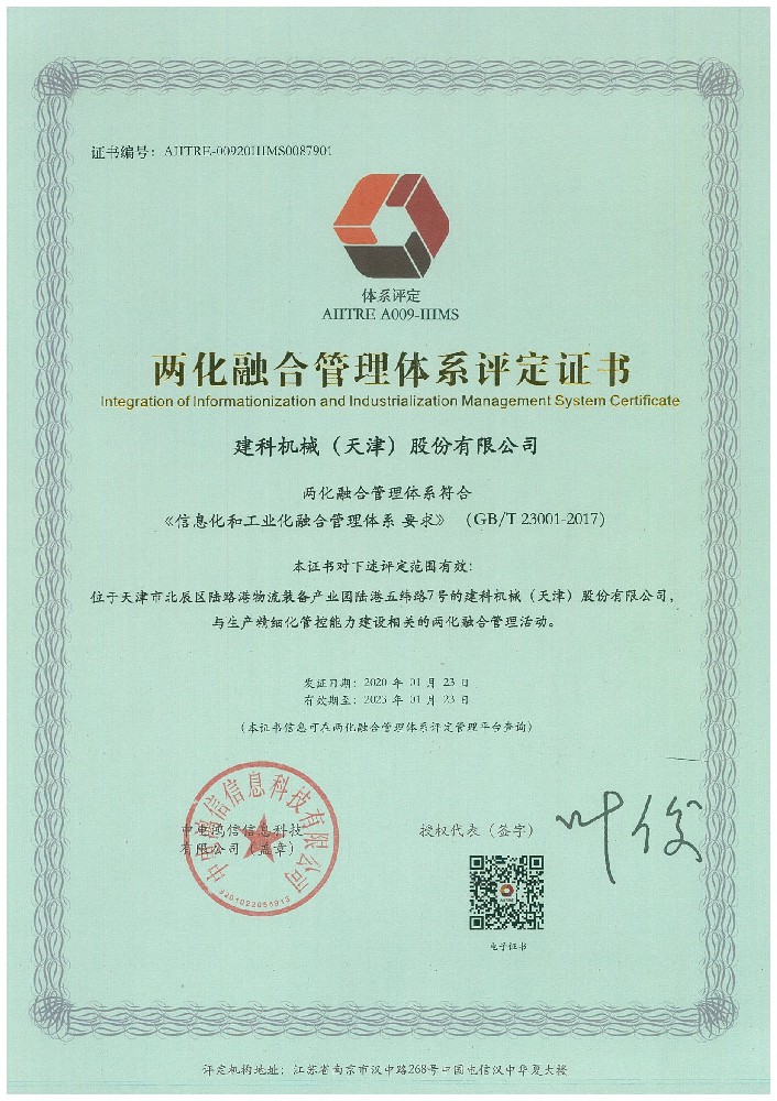 兩化融合管理體系評定證書