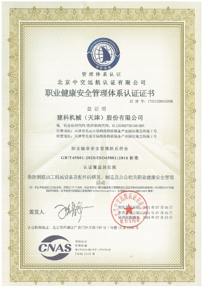 職業健康安全管理體系認證證書