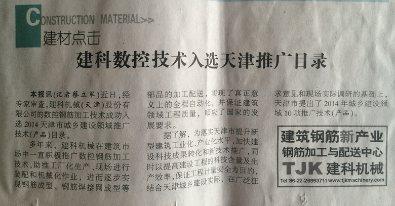 本報訊(記者蔡立軍)近日,經專家審查,建科機械(天津)股份有限公司的數控鋼筋加工技術成功入選2014天津市城鄉建設領域推廣技術(產品)目錄。