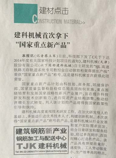本報訊(記者蔡立軍)日前,科技部下發了《關于下達2014年度有關國家科技計劃項目的通知》,建科機械(天津)股份有限公司(以下簡稱建科機械)自主研發的“SJL高速鐵路無砟軌道系統專用數控全自動鋼筋桁架焊接生產線”榮獲“國家重點新產品”稱號,這是建科機械首次獲得此項榮譽。