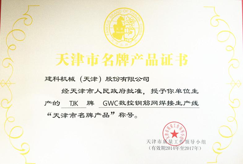 近日,天津市(shi)質(zhi)量工作領導小組發(fa)布(bu)2014年天津市(shi)名(ming)牌(pai)(pai)(pai)產(chan)品公告(gao)。經天津市(shi)人(ren)民政府批準,建(jian)科機械(天津)股份有限(xian)公司生產(chan)的(de)TJK牌(pai)(pai)(pai)GWC數控鋼筋網焊接生產(chan)線榮(rong)獲“天津市(shi)名(ming)牌(pai)(pai)(pai)產(chan)品”稱(cheng)號(hao),這是天津建(jian)科實(shi)施品牌(pai)(pai)(pai)戰略(lve)取(qu)得的(de)又一喜人(ren)成果。